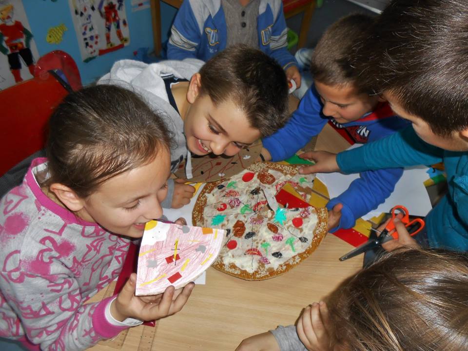 1. Игра "Купуваме-продаваме пица на парче"- Претставување на делови од цело (делови од круг)