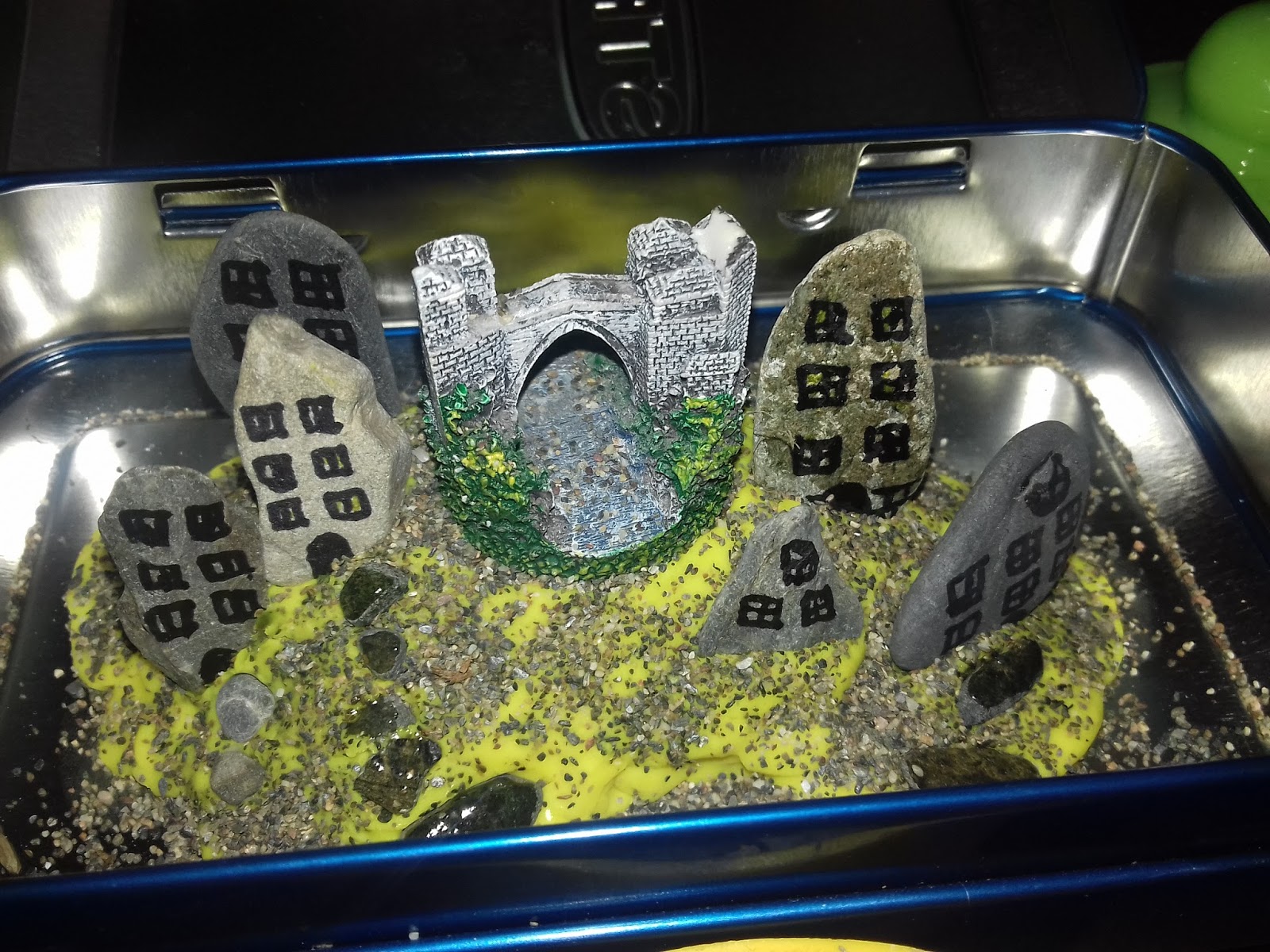 Цртањето на плоснати мали камчиња, нивно распоредување низ подлогата од пластелин, забодувањето на ситни камчиња за да се направат патеки низ градот,..бараат прецизна координација, трпение и истрајност, а тоа се вежби кои се секогаш корисни за дечињата но и добра, смирувачка занимација за возрасни кои сакаат креативна работа.