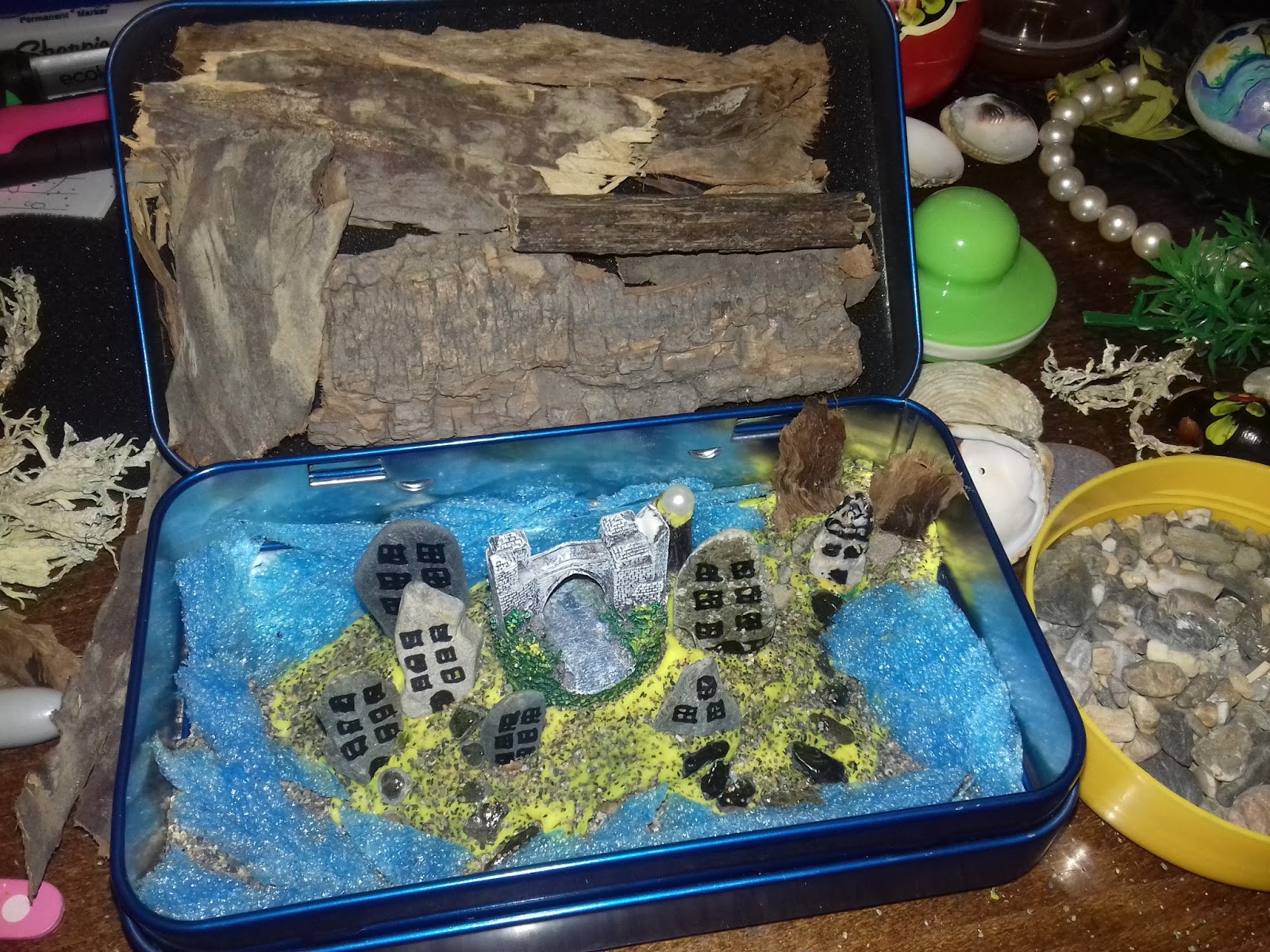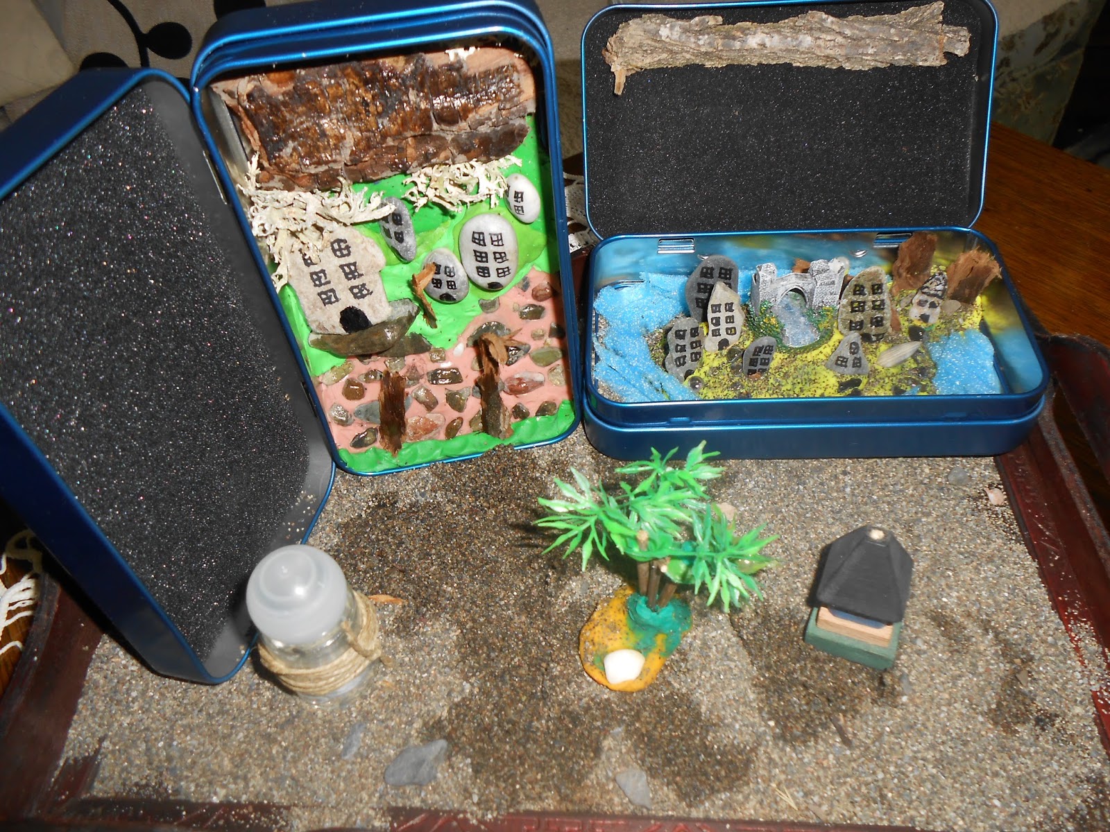 При изработка на нашите креативни макети, повторно ги вклучивме материјалите кои си ги собравме во разни теглички за време на одморот(песок, камчиња во разни форми и големини, дрвца, деланки.) Нив можете да ги обезбедите и сега, во близина на паркот, градилиште.. Нашата необична населба полека, полека ја сместивме на дното на стара метална кутија од парфем. Интересно е прво детето да нацрта скица на која би прикажало како очекува да изгледа нашето дело (распоред и големина на елементите)