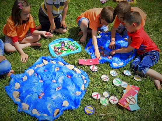 ВТОРАТА ГРУПА и ЧЕТВРТАТА ГРУПА на масата имаат- по две езерца од сини најлони, риби од хартија, лента со броеви до 20, гравчиња, капаци од тегли а на нив знакот еднаво направен со пластелин. СЕкое дете има лист со нацртани по два аквариуми(работниот лист горе) и лист за запшување на пресметките. Секој треба да пресмета за себе и да запише како броен израз (може да си помогне со користење на лената со броеви или гравчињата ИЛИ аквариумите и езерцата) Иако работаат индивидуално се договараме дека може да се советуваат меѓусебно со членовите од групата. Потоа во рамки на групата треба да разгледаат решенијата меѓусебно да се помагат доколку има грешки.