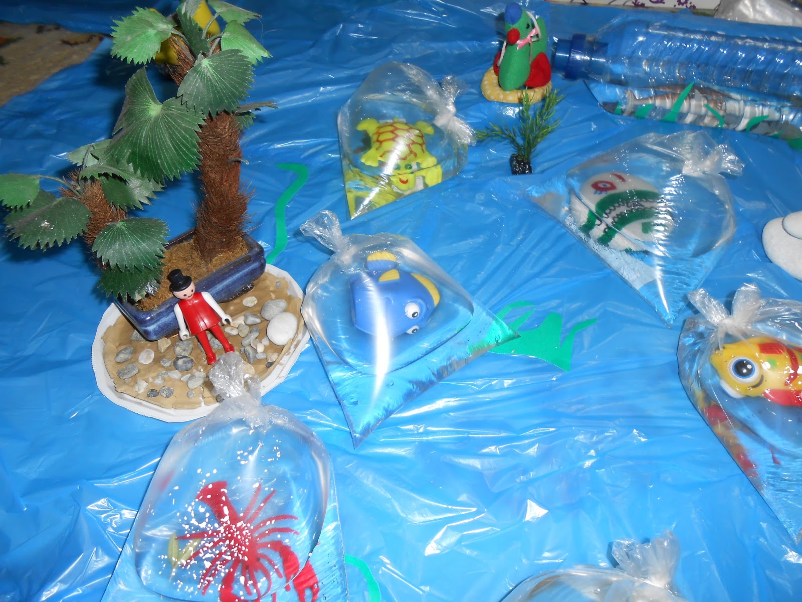 Средства: Море од син најлон, неколку риби од хартија на него, ликовите од приказната ставени секој во посебно најлонче со вода, големо пресечено шише полно со вода, брод, остров..