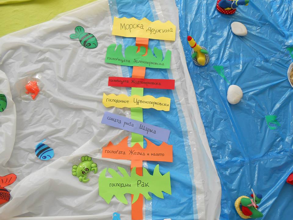 Штом дечињата ги слушнат имињата на ликовите преминуваме на нов предизвик- АЈДЕ ДА ОТКРИЕМЕ КОЈ Е КОЈ и каде е....Која би можела да биде госпоѓицата Црвеноперковска? Ги подигам полните кесички и ги поттикнувам дечињата да откриваме заедно. Имињата на ликовите можат многу да ни помогнат но треба да бидеме внимателни затоа што неколку разлики во имињата се навистина важни за правилна идентификација. Штом откриеме кој е кој, ги враќам кесичките на свое место, распоредни низ морето и ги повикувам дечињата внимателно да ја слушаат приказната и да бидат спремни да ми помагаат во миговите кога ми е потребна нивна помош.