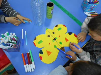 Ученикот ментор ја поставува почетната шема од едната страна на линијата, децата погодуваат што би можело да се добие со пресликување и ја грдат целината. Потоа во парови сами започнуваат шема и ја градат симетрично по своја замисла во насока да се добие конкретна слика, буква, број или шарена декорација. Користиме пластични затварачи достапни во нашето математичко катче и подлоги од збирката платна од стари чадори.