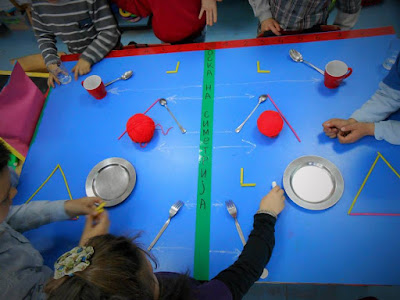 Oпис на заадачата на овие дечиња: Дуплирај слика преку линија, внимавај на оддалеченоста на предметите од линијата и нивната поставеност од другата страна..Почетната слика, распоред на предметите од едната страна на преполовената маса ја поставува наставникот или ученикот ментор.