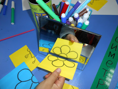 На учениците во овој центар им се понудени два типа на активности и следниот материјал за работа: Огледалца, подготвени половини од слики-цртежи од предмети, празни листови и боички. Почетната мотивација за истражување поаѓа од задачата: Проверете што ќе се случи ако листот со нацртана половина од предмет ќе го доближеме до огледало. На тој начин учениците сами откриваат дека со одразот во огледало сликата се комплетира во целина. Потаму љубопитни проверуваат со сите понудени листови.